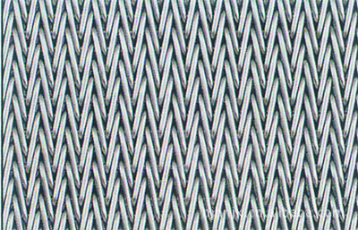 5,人字形网带:由左右交替的网条通过四根直串条联结而成,精密的编织技术使网带既具有密度高网孔细运行灵活的特点,它对材料和编织技术要求极高。此网带适合于细小承载物的输送线。
