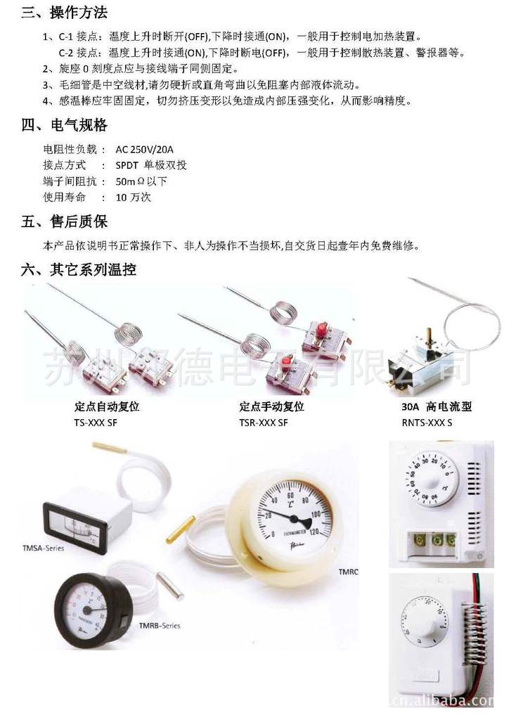 TSR-xxx SF 单温度点控制,温度到达设定温度时动作,温度下降后接点不会自动复位,需手按红色按钮使其复位