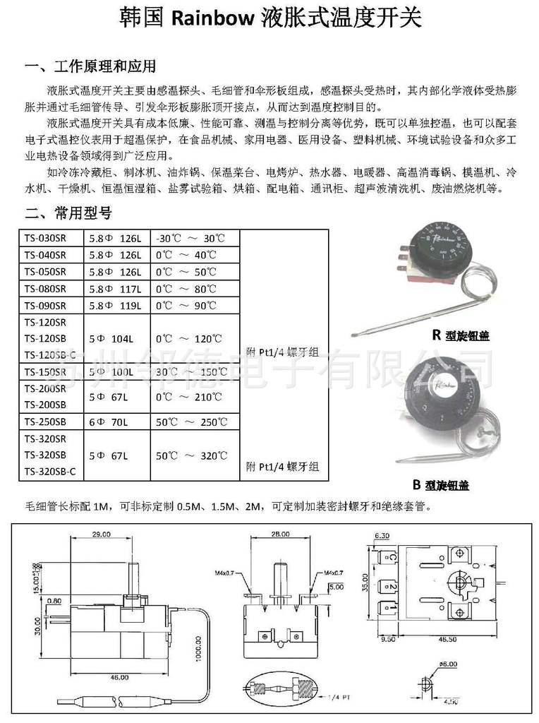 韩国Rainbow液胀式温度开关---定温型