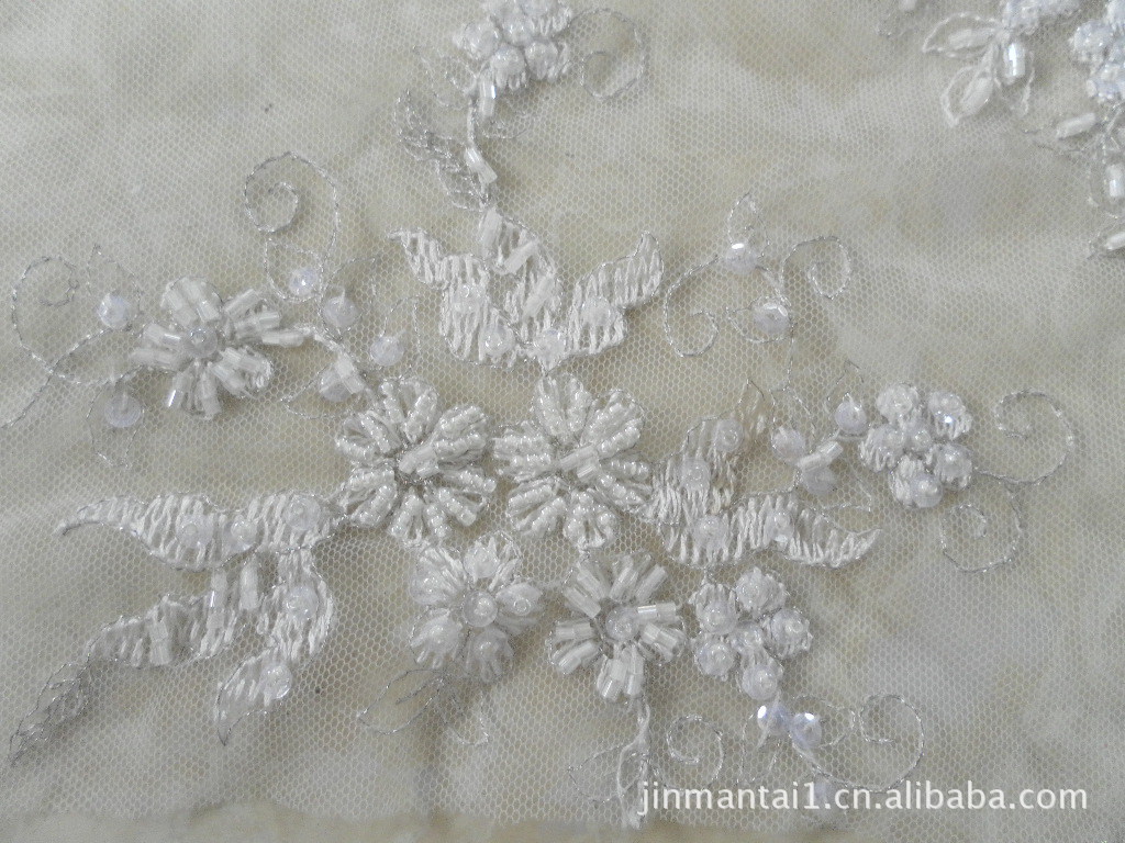 1.品名:全涤网布手工盘带加手工串珠绣花面料