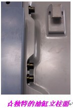☆进口五面体加工中心一次加工成型 ☆机 架 ◆机架采用欧洲进口五面体加工中心一次加工性成形,保证了各安装面的平行度及垂直度 ◆机架喷砂除锈,并喷有防锈漆 ◆涂装采用立邦聚氨脂漆 3、滑块结构
