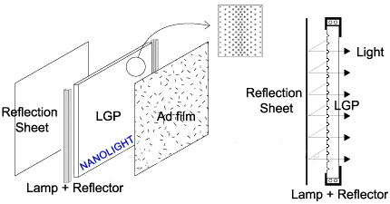 纳米导光板外观与压克力(有机玻璃)无任何差异。其基本原理是在有机玻璃浇铸时添加入纳米级光散射粒子,该纳米粒子能将点光源或线光源高效地转换为均匀的面光源。该产品是光学与材料科学尖端技术融合的结晶。纳米导光板可适用于T4T5、LED、CCFL、EEFL等不同类型的光源。