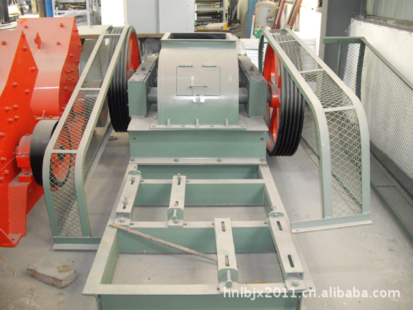 3.驱动机构是由两个电动机,通过三角皮带传动到槽轮上拖动辊轮,按照相对方向运动旋转。在破碎物料时,物料从进料口通过辊轮,经碾压而破碎,破碎后的成品从底架下面排出。