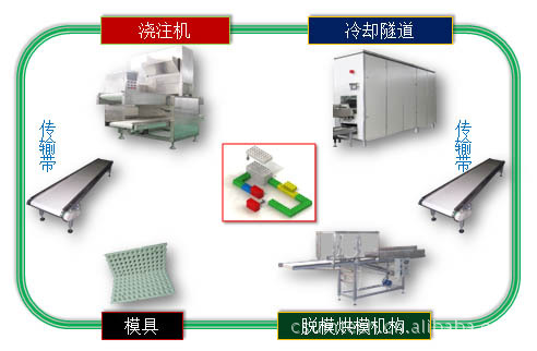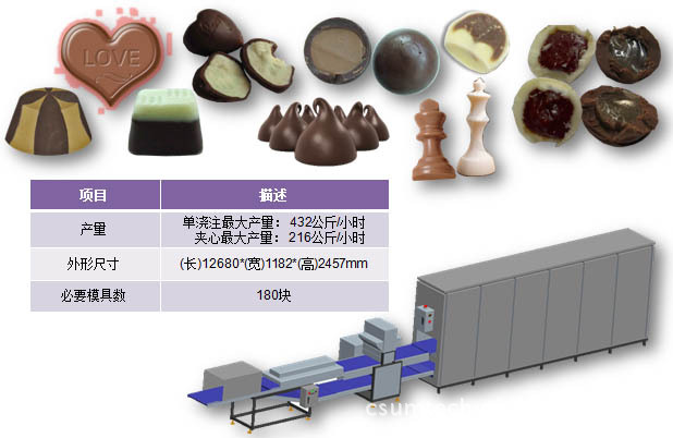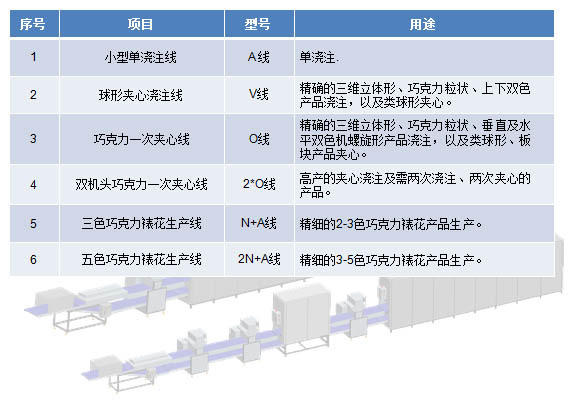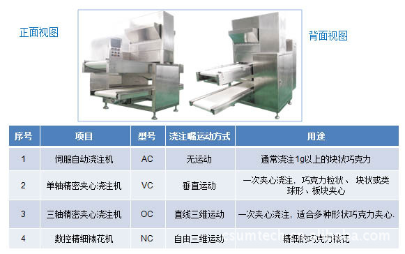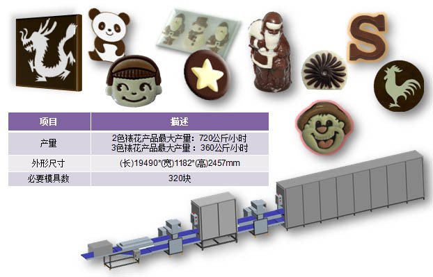 精确的三维立体形、巧克力粒状、垂直及水平双色机螺旋形产品浇注,以及类球形、板块产品夹心。
