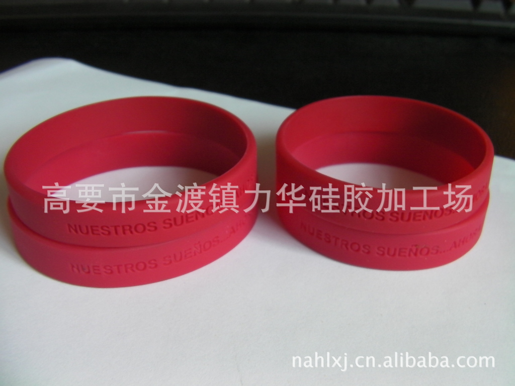 硅胶产品特点:由100%硅胶材质制成的手环有柔软、不开裂、使用寿命长、不刺激皮肤等优点。流行、前卫的环保硅胶手环,雕刻、印刷工艺,万种图案、千种色彩、潮流时尚。因材料质地柔软加上外观设计大方、简洁、颜色亮丽、深受国内外客户喜爱。此乃时下正流行的一种彩色硅胶饰品,戴于手上,是追星族和促销的时尚用品。生产工艺有:凹刻,凸字,添色,夜光,感温,感光,混色,分段,印刷等为目前流行款式,长期出口欧美,有公司多种款式可供选择,也可根据客户要求定做款式!!