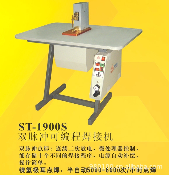 ST-1900S双脉冲可编程焊接机,双脉冲点焊:连续二次放电,微处理器控制,能存储十个不同的焊接程序,电源自动补偿,操作简单.镍氢极耳点焊:半自动5000-6000次/小时点焊