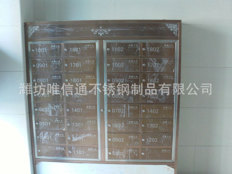 工艺流程:1、开料选材,选择不同材质的不锈钢,常用的有201不锈钢(室内)、304不锈钢(室外),2、彩用剪板机,折弯机等机器进行剪、折、抛加工,3、进行拼装焊接,4,对其表面进行磨砂、拉丝、喷砂,蚀刻等表面处理。5,包装。产品优势与特点:可根据客户要求制作出不同尺寸,不同规格,可以跟据环境的不同进行创意性的设计,做到美与大方融为一体,环境与箱统一协调。整体设计,工艺独特,设计新颖,外观精美,品种丰富。产品优势与特点:可根据客户要求制作出不同尺寸,不同规格,可以跟据环境的不同进行创意性的设计,做到美与大方融为一体,环境与箱统一协调。整体设计,工艺独特,设计新颖,外观精美,品种丰富。实际价格面议, 量大从优 欢迎各界朋友莅临唯信通不锈钢制品有限公司参观、指导和业务洽谈 如遇旺旺不在线或是您电脑没有安装旺旺时, 网站内价格一般为参考价格,产品订货数量在100个以上的批发客户,请联系本公司客服,我们必 将以最低的价格和服务呈现给您! 专业厂商制作,根据客户的需求量身定做,外观新颖,价格合理。 唯信通不锈钢信报箱 1.材质:选用优质304#或201#不锈钢制作,厚度1.0mm/0.9mm/0.8mm,表面拉丝处理,外刷不锈钢保护漆。 2.配件:每户信报箱配专用锁和钥匙,一户一锁。配固定膨胀螺栓数枚,安装操作简单方便。 3.适用范围:本公司生产的各类信报箱、奶报箱、意见箱,适用于各小区物业、街道、学校等公共场所, 造型美观大方,结实耐用! 4.产品保养与维护:切勿用带酸性或碱性的清洁剂擦洗,只需用柔软的布沾少许工业酒精轻轻擦之即可光 亮如新。室外使用时间一年左右,可使用专用保护漆定期保养一次,操作简单方便。 QQ:595933023;876061033 联系人:庹生18653606050;李生:18603049636;爱生:18677109116;