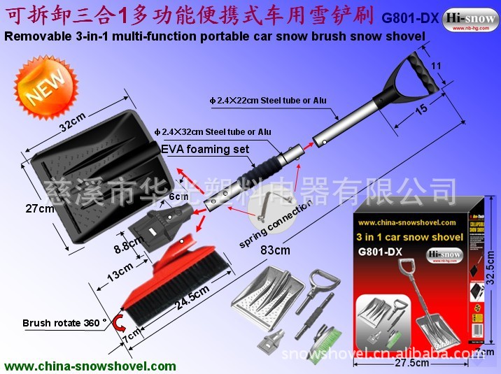塑料雪铲头宽47cm,高37cm 头部装45.5cm长铝合金保护条 大幅提高使用寿命 配φ2.8×105cm木柄或钢管或铝管 钢管表面喷塑(铝管表面氧化) 全长135cm 把手与雪铲头材料为PP(耐底温-30℃) 颜色可按色卡号生产 |