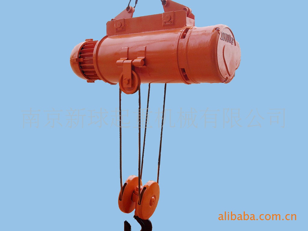 钢丝绳电动葫芦 产品特点:重量轻、体积小、结构紧凑、品种规格多、运行平稳,操作简单,使用方便。它们可以在同一平面上做直的、弯曲的、循环的架空轨道上使用,可以安装在葫芦单梁、桥式起重机,门式起重机、悬臂起重机等多种起重机上。稍加改动,还可作卷扬用。因此,它是工厂、矿山、港口、仓库、商店等常用的起重机设备之一,是提高劳动效率,改善劳动条件的必备机械。为满足用户各种工况特殊需要,在钢丝绳电动葫芦的基础上为用户设计生产特殊用途的各种规格产品多达一百余种,电动葫芦使用在特别重要场所时,应装设第二制动器,根据用户的使用要求,我厂还生产除有锥形转子制动电动机正常制外,还可以在减速器的高速轴上增加一套弹簧电磁失电制动器,增加制动安全性。