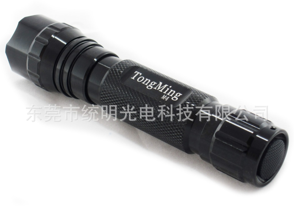 【产品型号】:M4 【灯珠类型】:CREE Q5 LED 【灯珠寿命】:100000H 【材 质】:航天等级强化铝材T6061 【表面处理】:硬质阳极氧化钛色 【镜片材质】:进口钢化镜片 【光 色】:暖白 【亮 度】:250流明 【射 程】:150米 【电 池】:1*18650(3000HMA)Li-ion电池 【电 压】:3.7-4.2V 【灯光模式】:(强光-中光-弱光-警闪-SOS) 【照明时间】:强光4小时,中光6小时,弱光22小时 【充电时间】:5-6小时 【产品规格】:长:135mm,头外直径:35mm【重 量】:100g(不包电池) 【开关方式】:尾部按键式开关