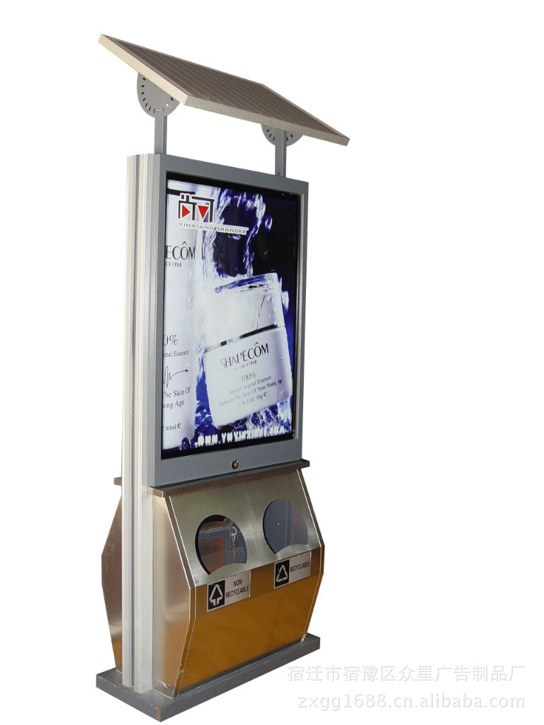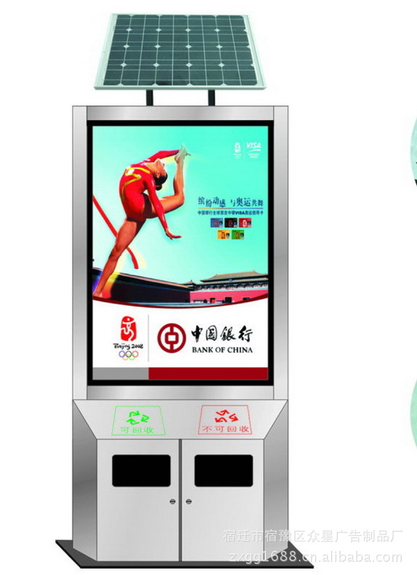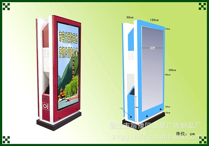宿迁众星广告制品厂 是一家专业从事广告和终端广告载体制品的研发、制作、生产、销售为一体的高新技术企业。我公司主要产品包括:广告垃圾箱,渐变式自动换画广告灯箱,不锈钢滚动灯箱,滚动换画灯箱,多画面滚动灯箱,滚动灯箱配件 ,换画灯箱配件,广告灯箱,滚动换画擦鞋机,公交车站牌,ATM 取款机防护罩,小区灭蚊广告灯箱,滚动阅报栏,产品自主设计、加工、制作,以“质量第一,服务至上”的宗旨向客户提供优质的产品和周全的服务。滚动广告灯箱是在户外广告牌中刚刚崛起的一种新的广告方式。它又称为动换画灯箱(Scrolling Panel), 采用微电脑控制,以转动卷画的方式依次显示9到12幅不同的广告画面,一组灯箱可同步运行。各画面的停留时间可由客户通过专用控制器键盘精确设定,设定范围1至30秒,运行安静,画面变换平稳顺畅。 超低价位,超大容量一块平面广告牌(2.2*1.5)的投放价格大约在3000元之间,而同样大小滚动灯箱则拥有其9~12倍的超大投放量。价格却还不到其1/4。 冲击力强,持续时间长由于这种广告具有滚动特性,其不断变换的广告画面能最大限度的吸引受众的注意力,具有极强的冲击力。根据调查显示,由于画面更迭出现,使得行人愿意停下来观看的时间增加了25%,如果刚好在画面滚动时,这种机会还会增加1倍。 无疑增大了广告主投放广告的受众率。由此可见,选择滚动灯箱可以带给您无限的商机。