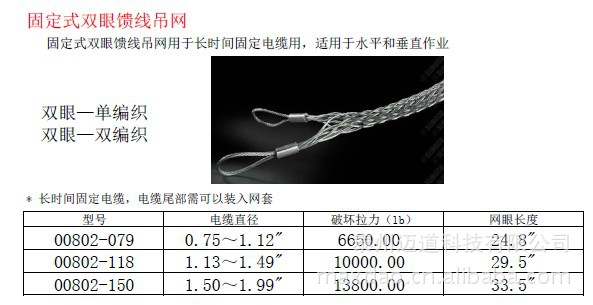 本产品广泛用于电力、电信行业。本产品采用优质钢丝编制,品种多,规格齐。为防止电缆特定部位因受力过大而损坏或缩短使用寿命。适用于各种不同外径电缆,使电缆受力均匀且拉力大,防腐蚀设计,寿命长,可替代进口产品