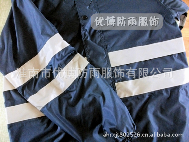 该款式为双面穿高档雨衣套装。高档防雨面料加涂100%防水PVC涂层,双面防雨设计,外加高强度反光条,可拆卸式帽子,防盗防水口袋,松紧袖口和裤腰设计,款式休闲!安全实用!是理想的安全的户外防护雨衣!适用于路政,交通,等行业穿着。