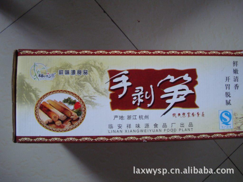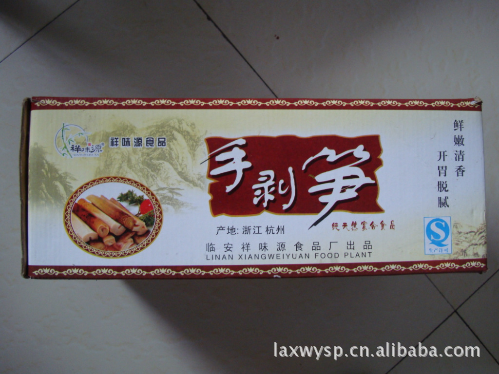 手剥笋又称带壳笋,开袋即食,既可作为休闲食品,又可用于餐桌,是临安市近几年开发的竹笋加工新产品,属于临安的特产。 是利用天目山地带高山小笋,经长时间蒸、煮、高温杀菌精制而成的,较好地保持了山地野笋的原始口味。又称带壳笋、健脚笋,开袋后味道清鲜纯正,品尝后能立马感受到来自大自然的独特味道,可做为一道精美的冷菜,也可作为礼品馈赠或旅游休闲食品;因其在加工过程中不去壳,食用时用手剥壳而得名。 手剥笋加工流程:原料---分级---漂洗---调味---预煮---冷却---整形---漂洗---灭菌---装袋---抽气封袋---灭菌---冷却---成品入库 特点:具有高蛋白,低脂肪、低淀粉、多纤维等特点,历来被视为菜中精品。 *富含活性精纤维素,能促肠壁的蠕动... 这是道凉菜,一般能一口气连吃三四根。上来后,笋都一手半长左右,粗细适中,慢慢剥,从头吃到尾,开头是嫩笋部分,味道怪怪的,有点陈腐的感觉,吃到底根开始脆起来,咬起来发出咯嘣一响,味道也出来了,带鲜,微辣味,感觉还是很清新的。
