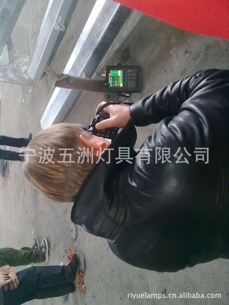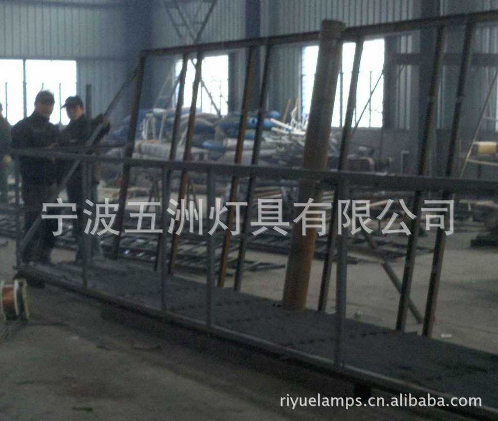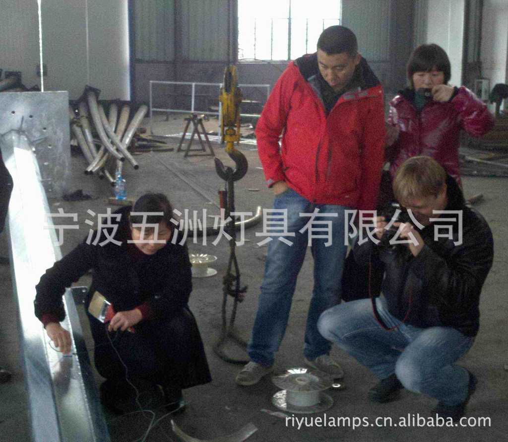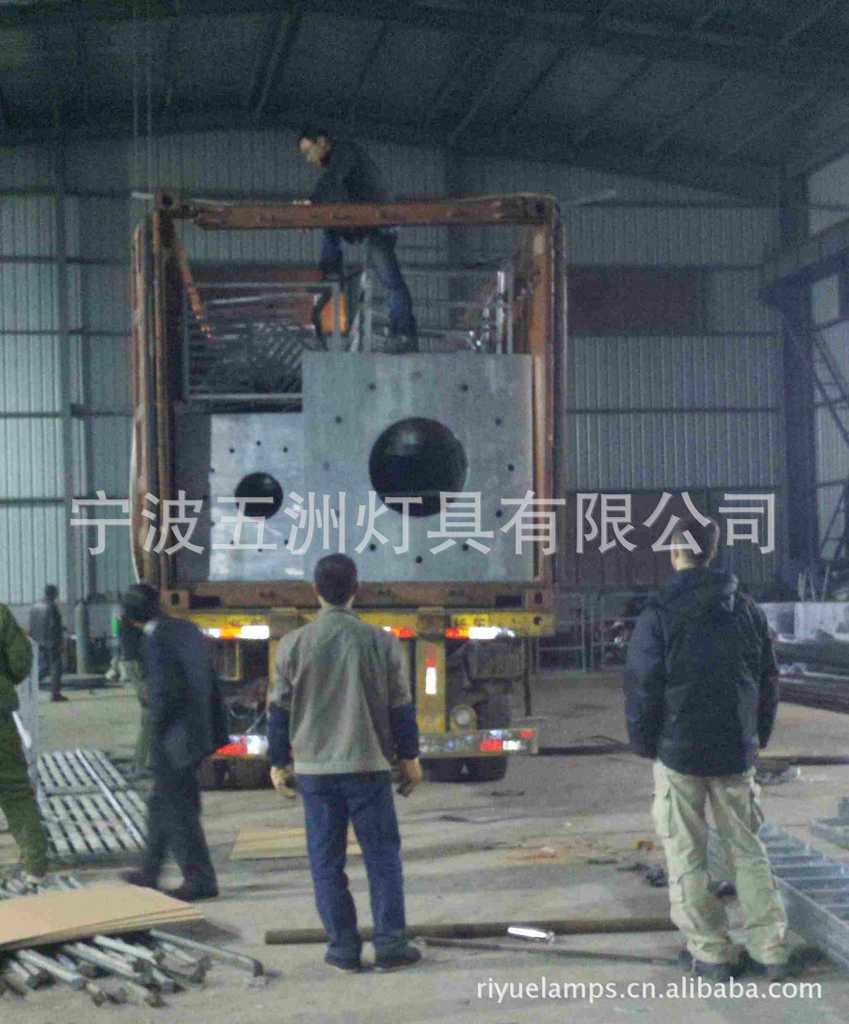 宁波大运车业高杆灯安装现场。 Q235钢板,多棱锥形,表面热镀锌喷塑,灯杆高度20米,框架式灯盘,可自动升降。菲利浦亚明一体化泛光灯光源。