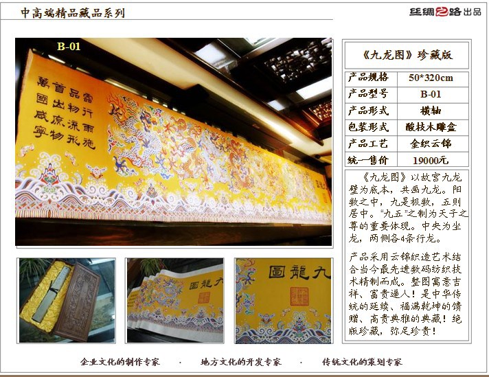 杭州丝绸之路文化艺术有限公司是国内最大的丝绸文化产品开发企业。为了传承东方文明,再现丝路繁华,丝绸之路文化艺术机构将现代数码技术和传统丝绸工艺相结合,以丝绸为材质,以中国书画表现形式,开发出的丝绸文化礼品,正在成为最具有中华五千年文化内涵的艺术礼品。丝绸之路文化艺术机构长期致力于各地特殊文化产品的开发,尤其以传统丝绸工艺为手段,以天然蚕丝为原料,以中国书画为表现形式的丝绸文化礼品,正成为各地政府招商引资、文化交流、经贸洽谈、外事活动和各类节庆的首选礼品。整合文化资源,开发文化产品,服务文化需求,进军文化产业,打造文化品牌是我们追求的目标。为促进各地地域文化的传承、普及和发展,愿有此共识的朋友,鼎立加盟,并肩同行,合作共赢。