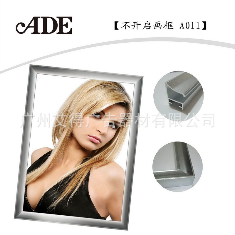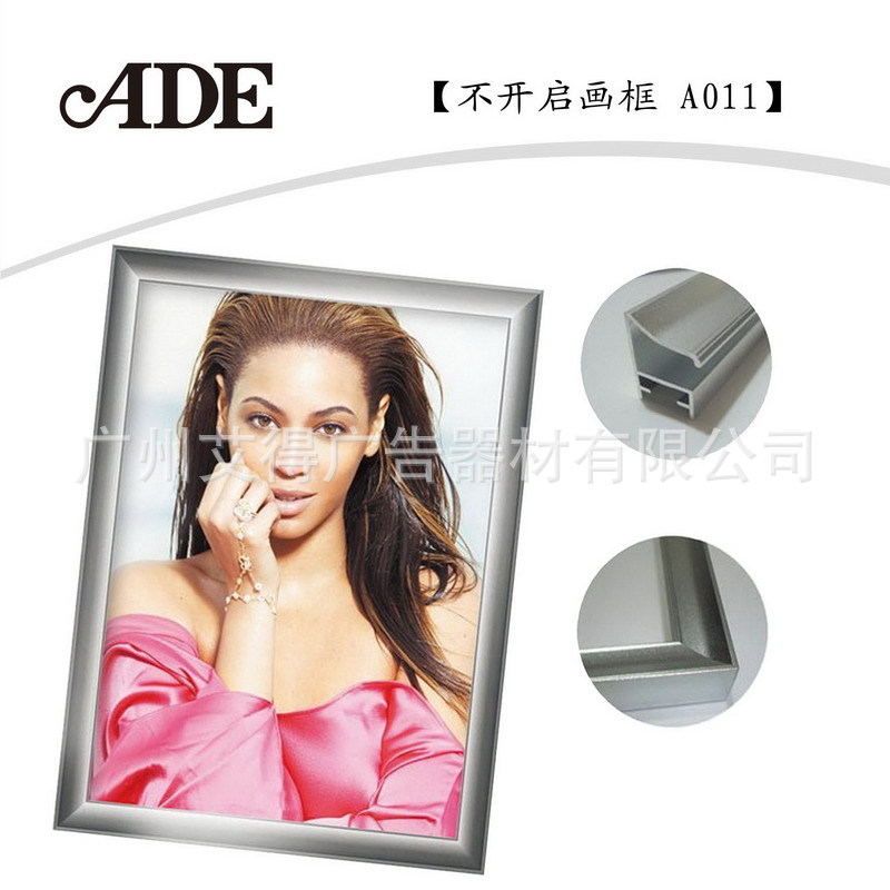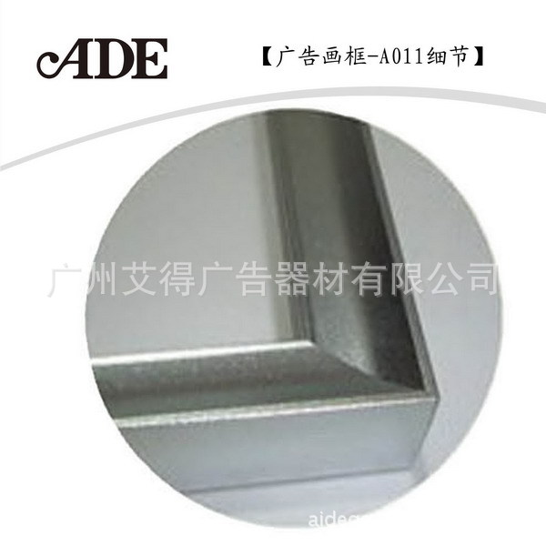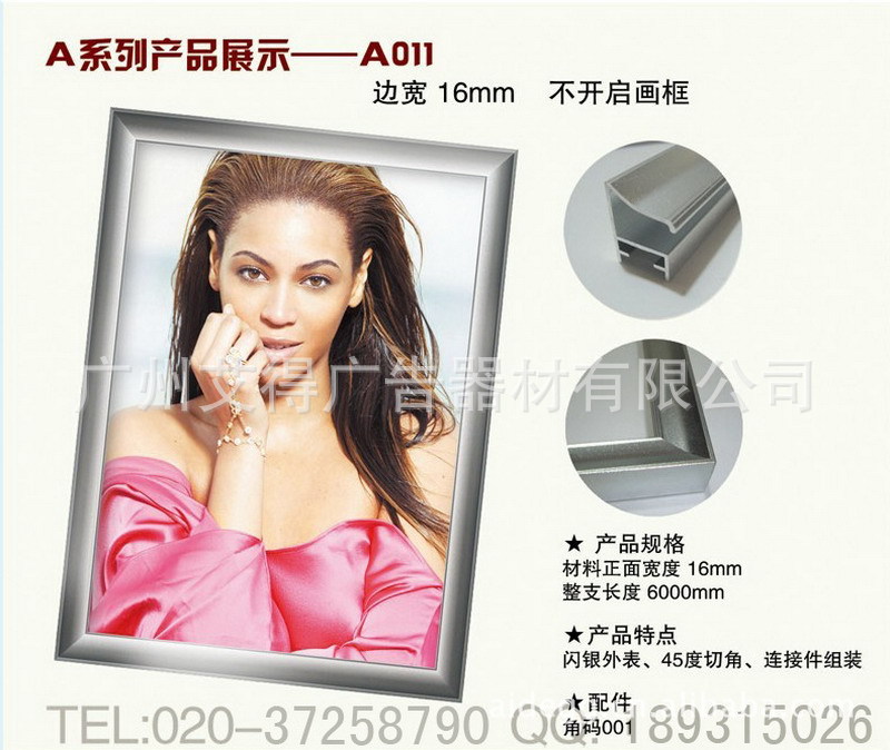 A011广告画框标准规格:A0=84.1X118.9 B0=100X141.4 A1=59.4X84.1 B1=70.7X100 A2=42.0X59.4 B2=50.0X70.7 A3=29.7X42.0 B3=35.3X50.0产品说明:边框16mm不开启固定框; 铝材的整支长度6米; 闪银外表,45°切角,连接件组装; 配件脚码:001;产品信息:终端广告宣传,优质铝合金材质广告画框,臻显高端。