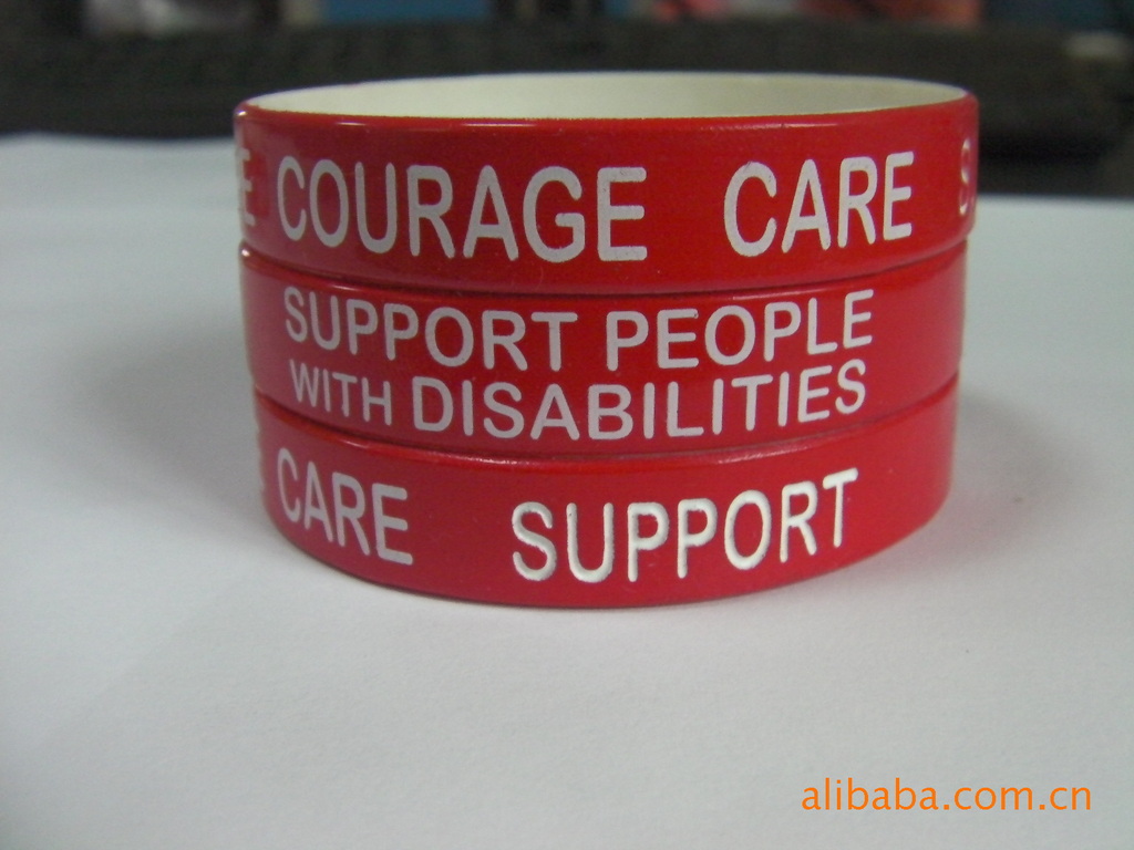硅胶产品特点:由100%硅胶材质制成的手环有柔软、不开裂、使用寿命长、不刺激皮肤等优点。流行、前卫的环保硅胶手环,雕刻、印刷工艺,万种图案、千种色彩、潮流时尚。因材料质地柔软加上外观设计大方、简洁、颜色亮丽、深受国内外客户喜爱。此乃时下正流行的一种彩色硅胶饰品,戴于手上,是追星族和促销的时尚用品。生产工艺有:凹刻,凸字,添色,夜光,感温,感光,混色,分段,印刷等为目前流行款式,长期出口欧美,有公司多种款式可供选择,也可根据客户要求定做款式!!