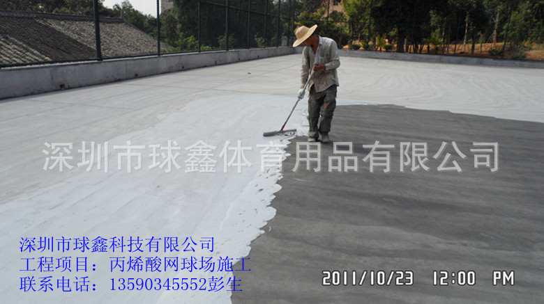 1)先用大型水磨机打磨施工面,将基本会掉的水泥打掉与粗糙地面,然后用用5%左右的稀盐酸泼洒并洗刷水泥基面,再用清水冲洗干净。观察存留水迹,对基面进行平整度和坡度的检验,用记号笔圈划出积水处。(全场修补完毕再放水检查,若球场平面积水处深度不超过3mm,即为合格,可进行下步施工。)清洗干燥后基面应无白色粉化物及浮尘物。填缝胶填充:在填缝前要先将混凝土伸缩缝清洁干净,并打上一道单组份封闭底漆。如缝较深或较宽的可用橡胶颗粒先作一个垫底,然后再填充;对部分特别凹陷部位可用填缝胶材料及胶料进行修补。