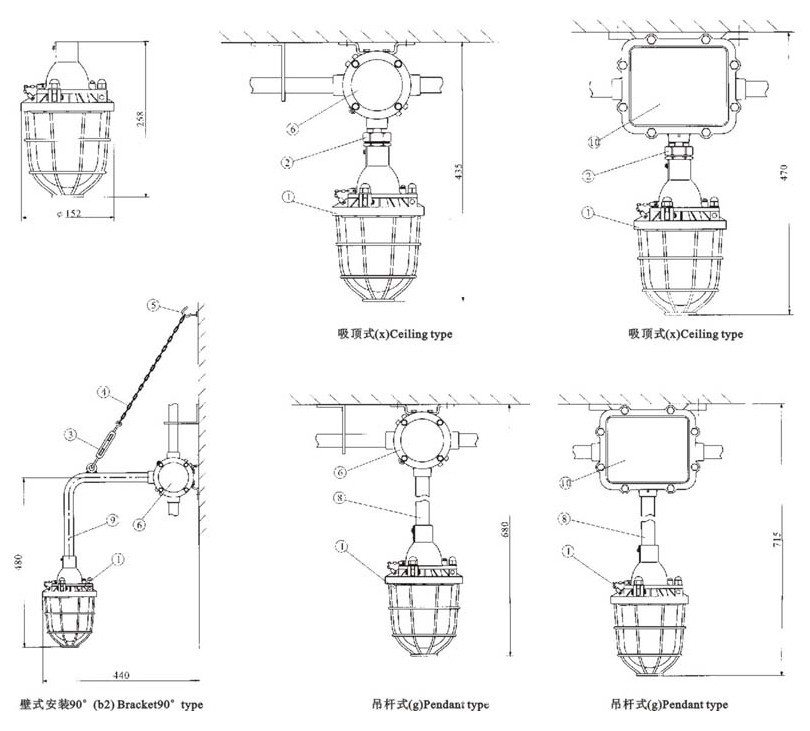 防爆灯的外壳采用ZL102铸铝合金压铸制成,玻璃罩采用钢化玻璃制成。防爆灯设有内外接地螺钉和接线腔,适合电缆或钢管布线。防爆灯可有多种安装方式,采用快速拆装结构,便于快速更换灯泡。一体式防爆灯,镇流器可放入灯体内,外型美观,分体式防爆灯,镇流器需另配。
