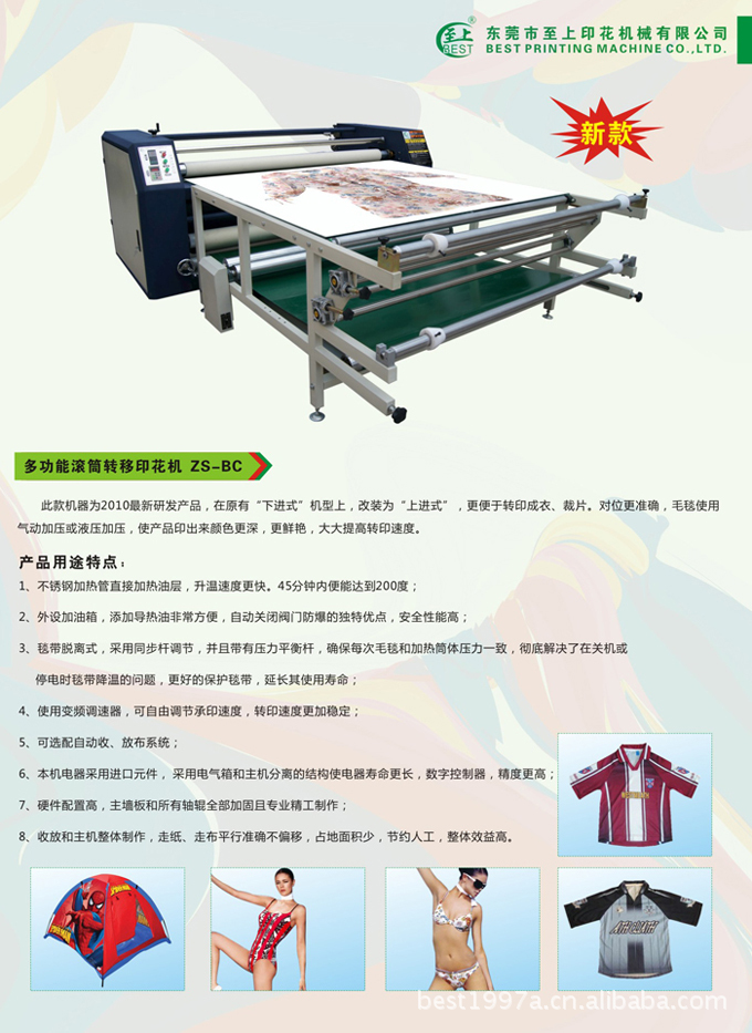 我们的印花设备广泛用于纺织布料制品,陶瓷制品,金属制品的热转印印花或热处理.适用于烫印服装、手袋、雨伞、鞋、帽、工艺品、礼品、广告用品等。可将发泡烫画、渗透烫画、幻彩烫画、升华烫画、植绒烫画、烫金烫画、泳装烫画、电子科技影像烫画、烫钻、烫珠、烫胶服装裁片,如泳装、运动服、纺织数码打样,匹布批量生产。等转印到自己所需要烫印物品上。