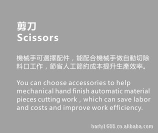 机械手专用剪刀★产品设计先进、结构合理、外形美观、质量优越★高精密产品源自高精密度★相比国内同类产品更卓越稳定、使用限期更长久。★配合机械手做自己切除料口工作,节省人工,节约成本,提升生产效率