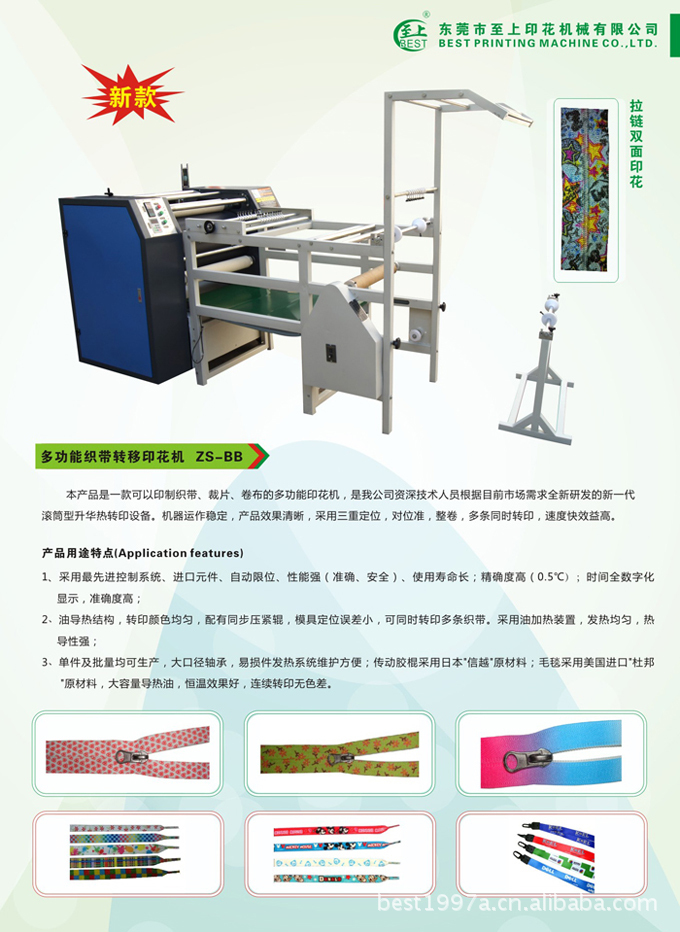 我们的印花设备广泛用于纺织布料制品,陶瓷制品,金属制品的热转印印花或热处理.适用于烫印服装、手袋、雨伞、鞋、帽、工艺品、礼品、广告用品等。可将发泡烫画、渗透烫画、幻彩烫画、升华烫画、植绒烫画、烫金烫画、泳装烫画、电子科技影像烫画、烫钻、烫珠、烫胶服装裁片,如泳装、运动服、纺织数码打样,匹布批量生产。等转印到自己所需要烫印物品上。