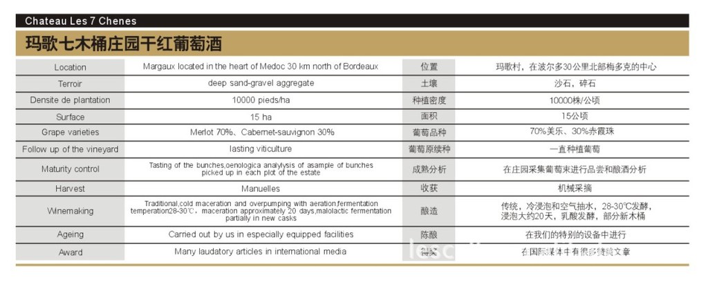 葡萄品种:解百纳-苏维浓(Cabermet Sauvignon)占75%;梅洛(Merlot)占20%;解百纳-弗朗(Cabemet Franc)和小华帝(Petite Verdot)占5%