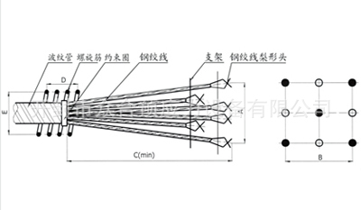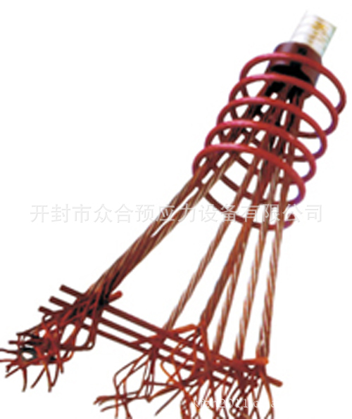 当需要把后张力传至混凝土时,可采用H型锚固体系。它包括带自锚头的一段钢绞线、支托自锚头用的钢筋支架、螺旋筋、约束圈、金属波纹管等。钢绞线梨形自锚头采用YH30型压花机挤压成形。