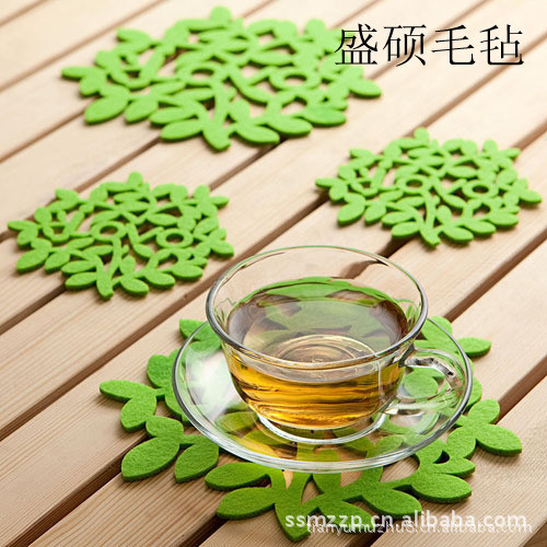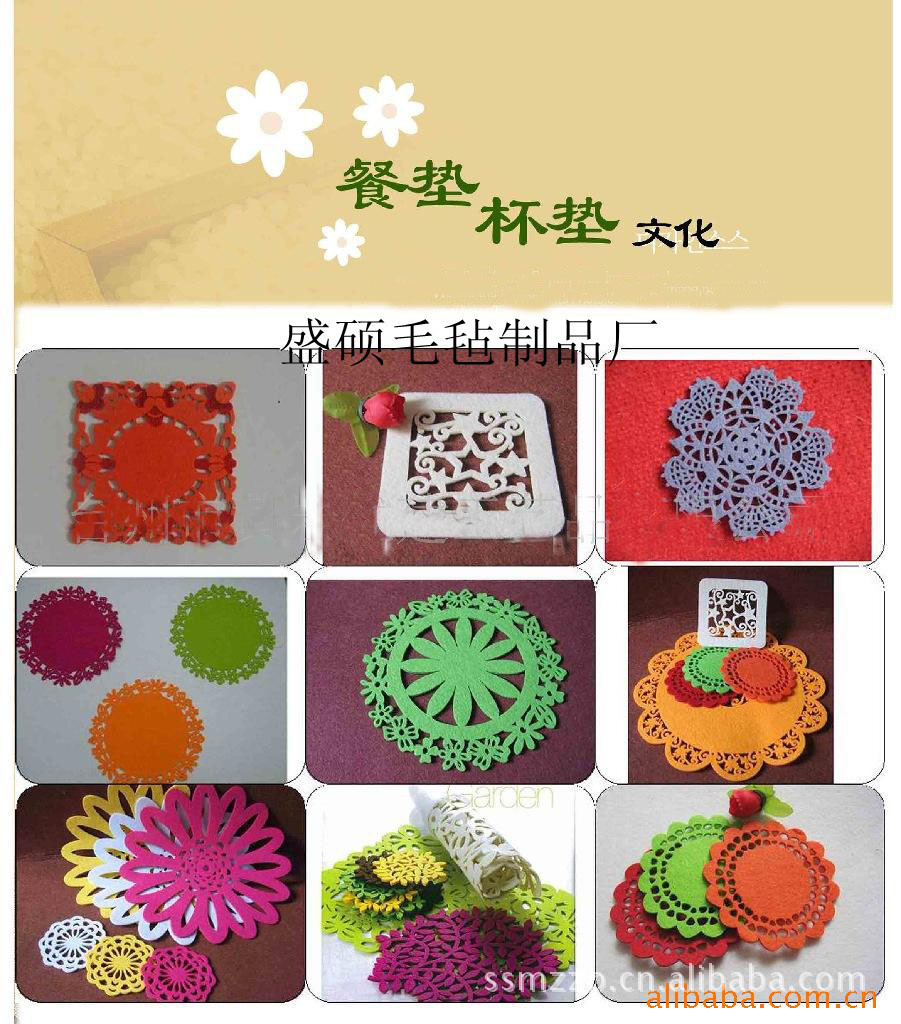 不用油漆的花纹更环保超可爱漂亮毛毡杯垫/盘垫/餐垫/花瓶垫产品特点造型和颜色都透出大自然的气息;耐磨的毛毡素材,可持久使用;能够充分隔热,保护桌子。