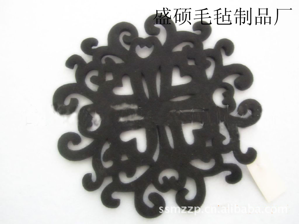 如图所示为无纺布杯垫(毛毡布杯垫),无纺布是国际上公认的新一代绿色环保材料,本款激光镂空无纺布餐垫,内部花形及外形均采用激光镂空切割而成,切口平整,切口自动融合,不散口,不脱丝。