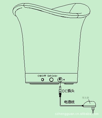 LED冰酒桶在运行5-8小时后,酒桶内的灯光会不停闪烁报警,此时应先按“ON/OFF”按键关断冰酒桶电源,然后如下图所示将图中DC插头插入冰酒桶内充电,请确保已经关断电源。
