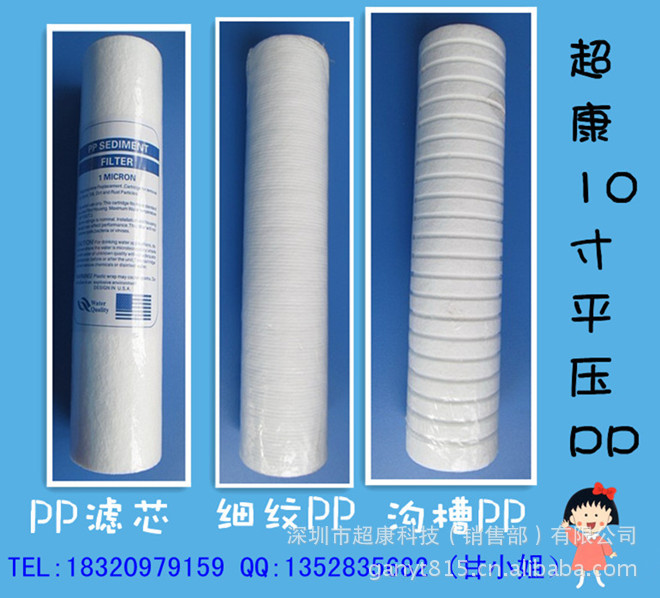 1、(1微米)PP棉滤芯(聚丙烯熔喷滤芯):孔径致密,均匀,可去除水中大部分的泥沙、铁锈、悬浮物、胶质、铜锈、淤泥、磷污、渣质等及各种杂质。水处理量:约8吨,3-6个月更换(出水明显减少请及时更换此滤芯)。