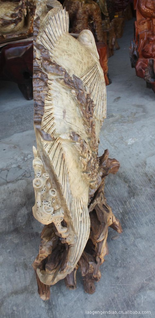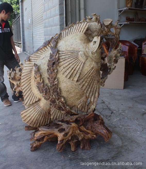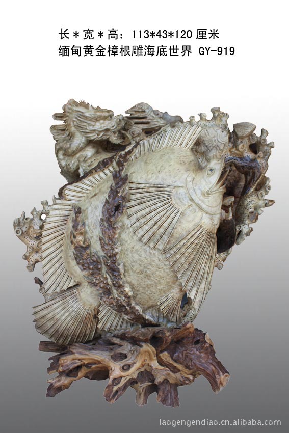 缅甸黄金樟根雕海底世界:取材上好的黄金樟材料,雕工精细,作品构思巧妙。外表造型自然、美观,纹理清晰,优美的造型是极富个性化的工艺品,有很强的感染力与装饰性,纯手工打造一副活生生的海底世界,鱼是招财的特别有利于横财,事实不但利于横财,更能祝福进步。鲤鱼跳龙门就是最好的兆头,意味着进步腾达,放于宅中可提升宅中所居之人的财运和健康,放于办公地可使生意蒸蒸日上,工作顺利。鱼音余,通过联想,人们赋于鱼以更多的美好祝福的想象空间。 “连年有余”,莲花、荷叶、鲤鱼是最常见的吉祥图案,表示生活富裕。