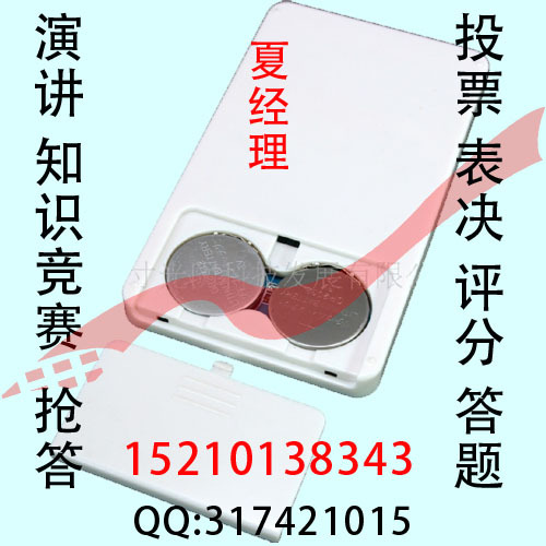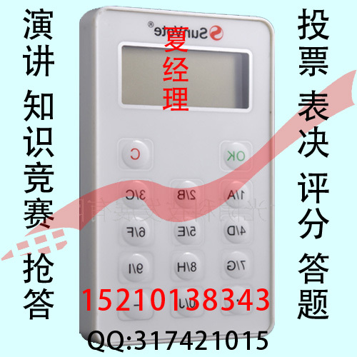 无线会议投票器供应商、生产厂家——北京寸光阴科技发展有限公司租售热线15210138343。2011年1月17号诺华制药销售年会在北京成功举办,医学专家采用投票互动方式有效调动了会场气氛,达到了极好的会议效果,会议可谓成功之极!!寸光阴科技是诺华制药指定投票器供应商,主要是寸光阴科技会议设备服务丰富的经验,专业的技术服务,能保证会议的高质量。表决器租赁出售无线投票器-9覆盖北京、上海、广州、南京、深圳、杭州、西安、成都等国内8大热点会议城市的寸光阴公司,独家提供目前市场上最高端的无线9投票表决器。公司覆盖全国近30个地区,并配置6500套无线表决器设备,能够同时在多个地区同步提供大型表决投票租赁出9售服务。公司所有表决器3租赁出售人员均接受过寸光阴总部专业技术指导并具有数百场的表决器租赁出售1服务经验。在过去的几年中陆续为1.空军法院系统“法官·人生·信念”主题演讲比赛。2.首届“亚洲神经与动力病理学高峰会议”;3.国家电网公司“我身边的党员”主题演讲比赛;4.市长之家——关于城市规划及低碳出行会议,有全国40多位市长参与;5.保监会——年会赛事计分;6.PICC——年会抽奖软件;7.能源基金会——投票表决答题;8.某大型制药公司——表决软件及表决器--100套;9.某红酒集团——答题软件及答题器300套;10.北京积水潭医院——答题软件及投票器100套;11.培训学校及中小学教学软件及答题器500套等;12.柏莱特视听AV设备有限公司上海会议;13.海军航空工程学院“首届信息化建设”演讲比赛;14.北京肿瘤医院、江西电视台的“红歌会”;15.盛景网联:“团队的力量”企业培训;16.北京电视台文艺频道:《我秀我舞台》歌唱比赛;17.湖南卫视杭州电视台的“我爱家庭秀”等知名栏目提供过圆满表决器租售服务。寸光阴投票器支持1-10个选项投票;赞成反对弃权表决;选手打分等功能,是目前市场是最高端的全功能投票表决系统。寸光阴信息全国服务热线:152-1013-8343公司网站:www.cgykj.com邮箱:xxhsyx@163.com服务内容:提供会议会展服务 可为您提供各项服务的城市:北京、上海、杭州、广州、苏州、无锡、常州、宁波、合肥、徐州、温州、连云港、青岛、大连、天津、沈阳、长春、西安、郑州、太原、武汉、长沙、成都、重庆、桂林、南宁、柳州、北海、厦门、福州、珠海、海口、三亚、西宁、宁夏、哈尔滨、呼和浩特、乌鲁木齐、拉萨等大中城市。寸光阴秉承“顾客至上,锐意进取”的经营理念,坚持“客户第一”的原则为广大客户提供优质的服务。如果您有需要请跟我们联系,并欢迎来电洽谈业务合作!联系人:夏经理 联系方式:15210138343