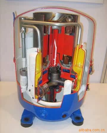 美优乐涡旋压缩机的压缩油位于压缩机上部的两个涡盘来完成,涡盘位于电机上方,吸气通过吸气接口进入压缩机,