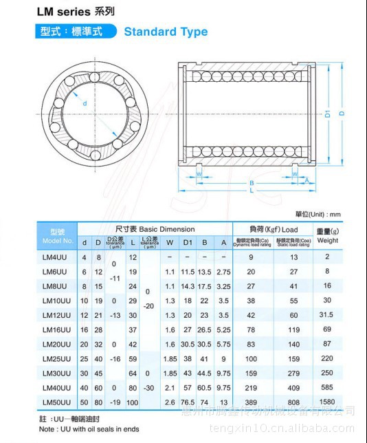 按规格制式分:直线轴承分为两大系列即LM和LME系列.其代号LM系列用于亚洲,以公制尺寸为标准,配用的直线轴外径公差一般是h7。LME系列多用于欧洲,美国、德国、意在利等地区。以英制尺寸为标准,也有公制尺寸,配用的直线轴外径公差一般是g6。两大系列结构特点,除尺寸不同,孔径公差不同,其结构大致一样。