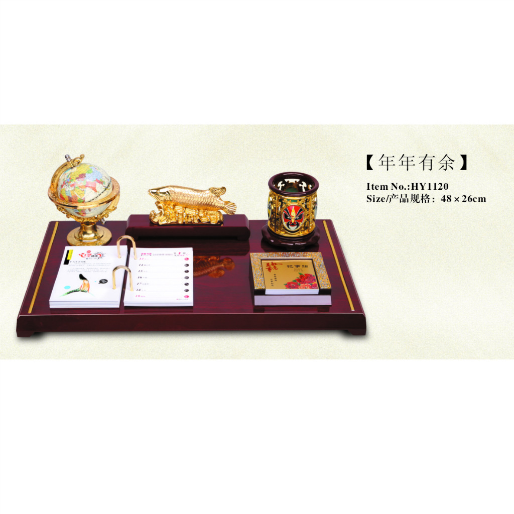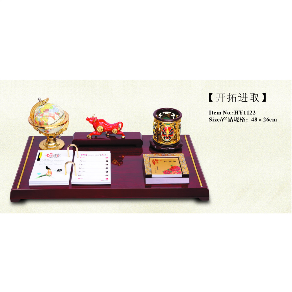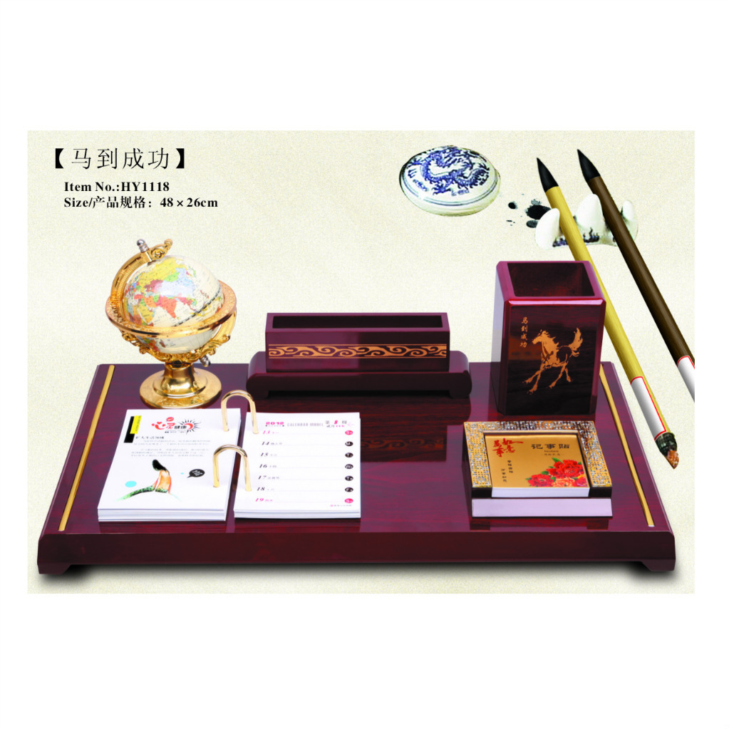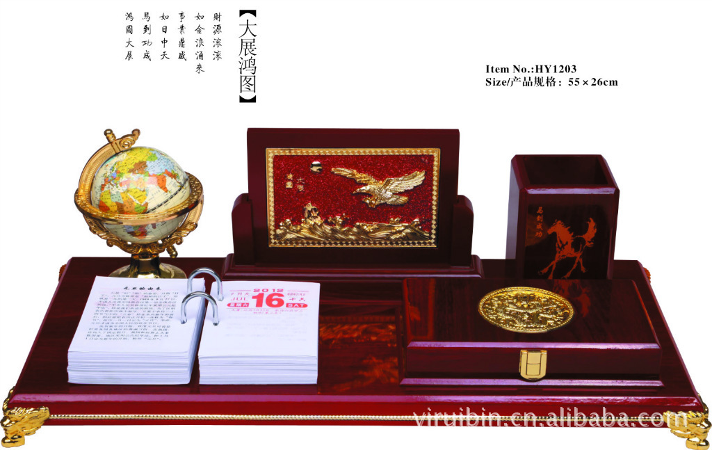 【配置】高级PVC地球仪,立体浮雕木制雕刻“大鹏展翅”屏风,木刻“马到成功”笔筒,镶金龙办公盒,4色彩印铜版纸366张记事台历内页,日历<可改成周历>、内页可选图案内容:健康中国味 等。