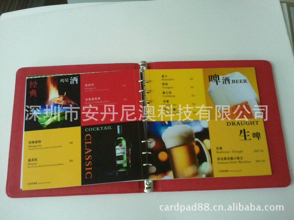 传统的餐厅,酒吧用的酒水牌都是以纸张印刷,过胶工艺为主,然而在使用的过程中,容易受潮,粘水后容易腐烂,寿命短,而且容易弯折,变形,起皱等不良现形,严重影响菜谱的使用寿命及店家形象,新兴的PVC材质酒水牌,印刷精美,耐磨耐刮,特别是不会受潮而变质,不会变形,质地高档,是很实用的精美菜牌,酒水牌,菜谱.........物美价廉。