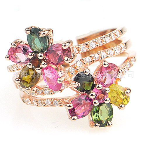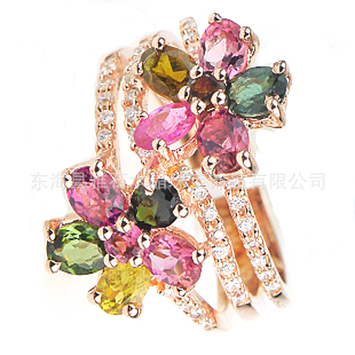 【名称】925银镀玫瑰金天然碧玺2朵小花镶水钻戒指