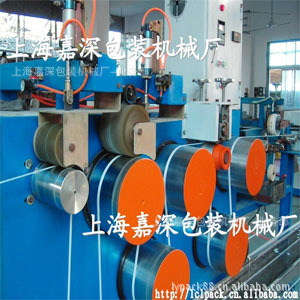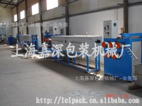 该生产线机用塑料打包带机组,是我司引进当代先进样机加以改进设计而成。该机组是生产聚丙烯塑料机用打包带和手用打包带的专用设备,全套机组由挤出、机头、冷却、牵引、加热、拉伸、压花、定型、卷取、电气等十个部分组成。该机螺杆设计特殊,机头模口间隙采用可调式设计,有利于变换产品规格。由于结构设计合理,因而具有产量高、塑化好、加工适应性强、操作简便、检修容易等优点。各项技术指标均达到国外同类型样机的先进水平,生产出的塑料带质量符合国家技术标准要求,选用该机组生产塑料捆扎材料,实为不可缺少的理想机械。