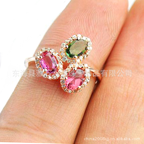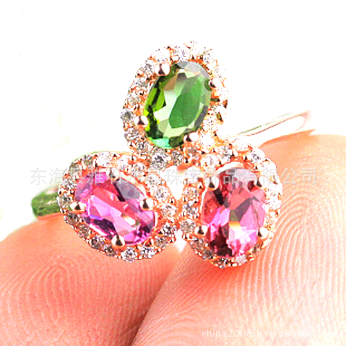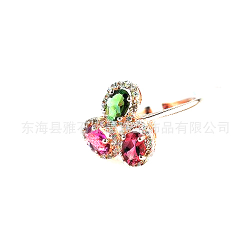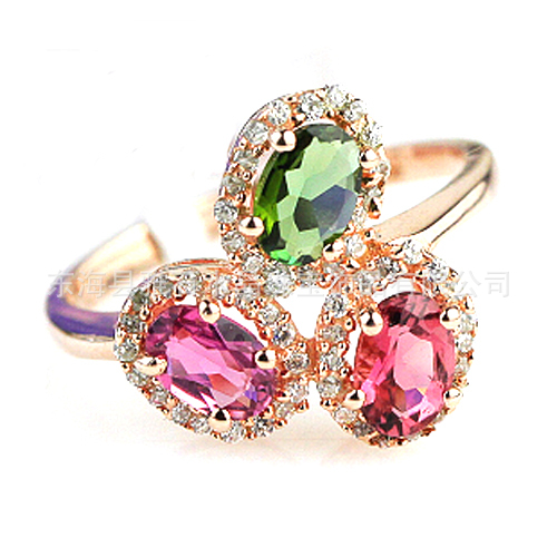 【名称】925银镀玫瑰金天然碧玺品字形镶水钻戒指