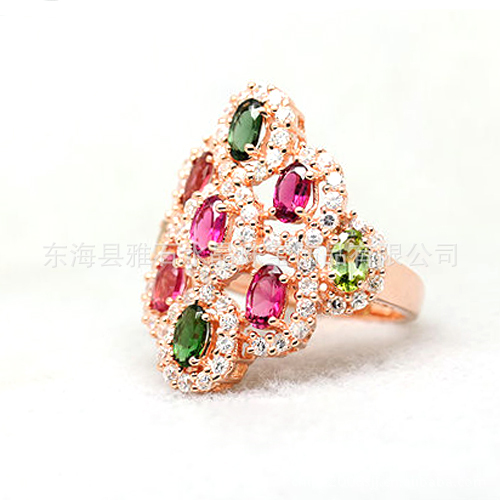【名称】925银镀玫瑰金天然碧玺菱形镶水钻戒指