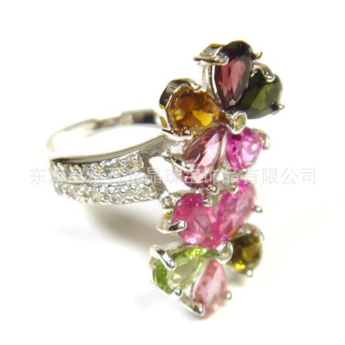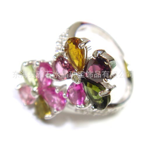 【名称】 925银镀白金天然彩色碧玺‘双生五星花’戒指