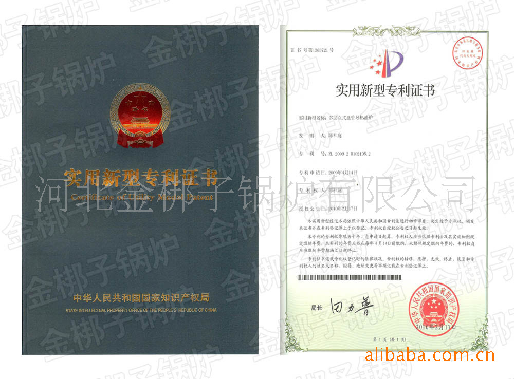 我公司生产的盘管式导热油炉结构在二代导热油炉的基础上多方面进行了革新设计,在国内同行业中率先推出了具有金梆子特色的导热油炉的新一代产品(节省燃料可达30%),每年按10个月每年可为用户省出一台锅炉,得到了广大用户的认可,我公司新型导热油炉于2009年4月14日申请批准,并于2010年2月17日授权获得“多层立式盘管导热油炉”实用新型专利。
