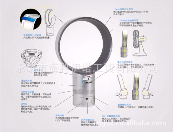 永康市海科伊诺工贸有限公司是一家集科研、生产、销售为一体的现代型企业。公司目前专业生产无叶风扇等新兴科技产品。现已拥有一批专业的研发团队,多项产品均由自主创新、自主生产、自主销售。产品设计新颖、精美实用、美观大方,紧跟时代潮流,多年来产品销往中国全国各地并同时销往北美、南美、欧洲、中东、俄罗斯、日本,韩国等三十多个国家和地区,拥有良好的口碑!是广大用户朋友的最佳选择!