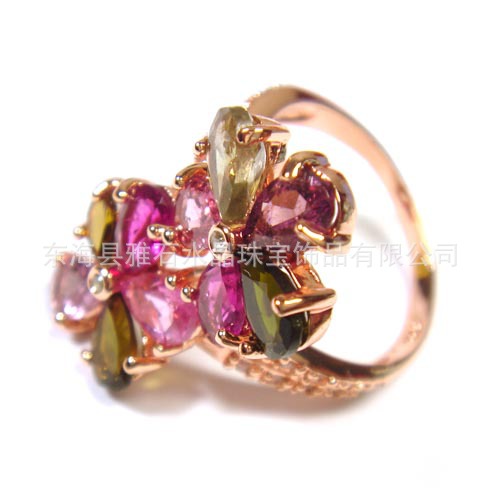 【名称】925银镀玫瑰金天然彩色碧玺‘双生五瓣花’镶钻戒指