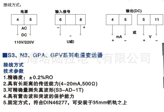 电量变送器是一种将补测电量参数(如电流、电压、功率、频率功率因素等型号)转换成隔离的直流电流、直流电压或数字信号的装置。产品符合国标GB/T 13850-1998。