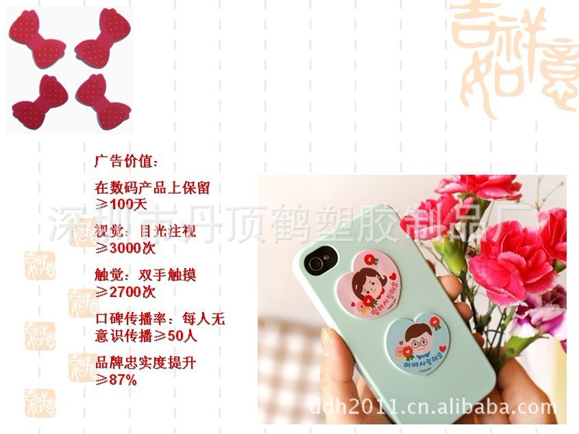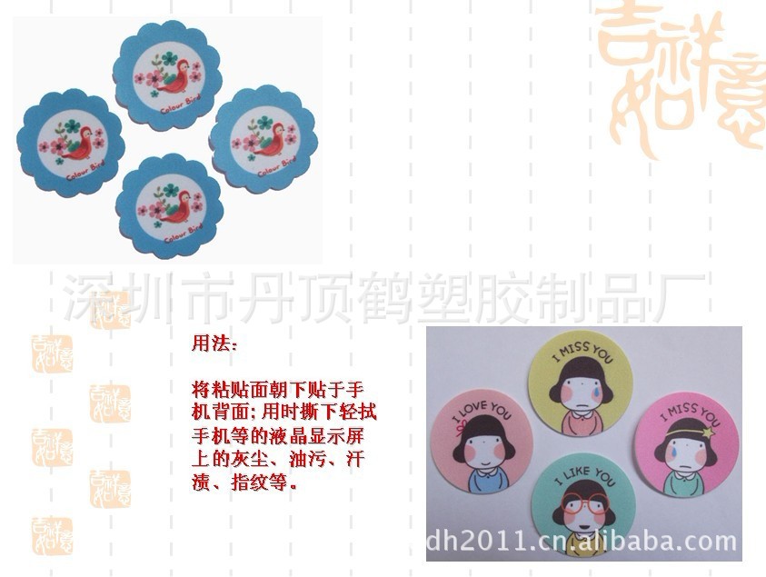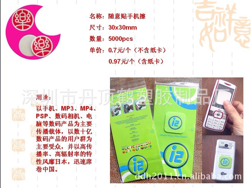 使用方法 | 1.产品正面能够轻易彻底地抹干净手机、MP3、MP4、PSP、电脑、游戏机、相机、CD碟片、PDA、眼镜等屏幕上的污渍、指纹等,不留痕迹,清洁效果超群 2. 背面采用超轻、超柔软的无限次粘贴的进口环保胶;高科技材料,可以反复黏贴,并且不易脱落,粘贴干净无痕迹。 3.随机携带,使用方便!以数十亿数码产品的用户群为主要受众,并以高传播率、高辐射率的特性风靡日本,迅速席卷中国。“成为都市生活中最具商业影响力的时尚传媒”是我们的追求和目标。 |