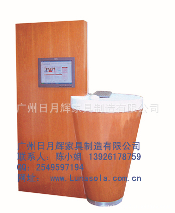 材质说明:高密度中纤板基材外贴银拉丝防火板;采用1mm以上厚钛金腐蚀板中的文字;采用5mm左右厚黑色亚克力材料雕刻方案,将方案粘贴柜面./高密度中纤板基材贴樱桃木饰面,进口环保油漆.人造石台面,不锈钢踢脚